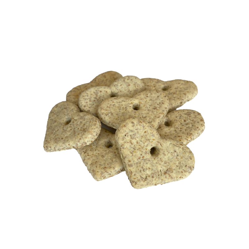 Biscotti a forma di cuore, con sola farina 100% integrale, per far assaporare a Fido la bontà artigianale in ogni momento della giornata.