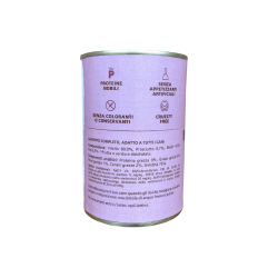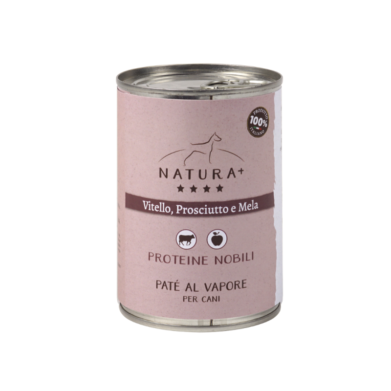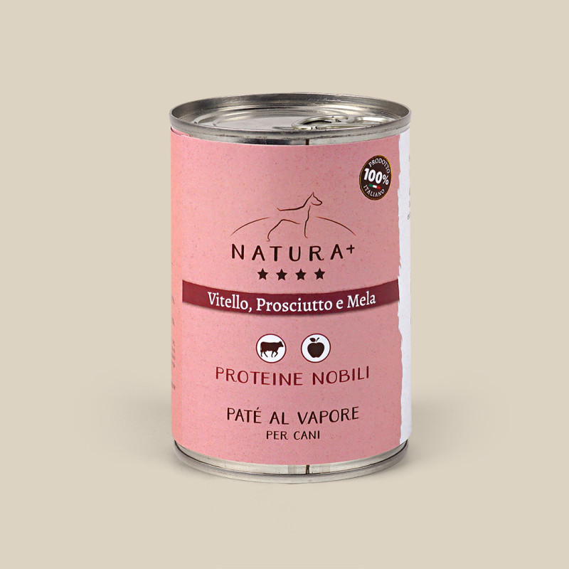 Paté con Vitello, Prosciutto e Mela, cotto delicatamente al vapore. Alimento ideale come pasto completo o sopra le crocchette. Lattina da 400gr.