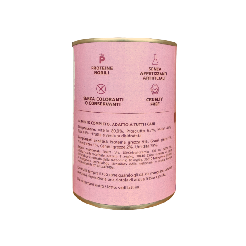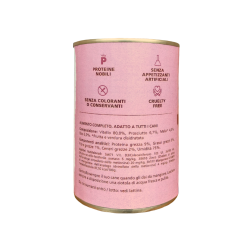 Paté con Salmone, Tonno e Piselli, 100% Grain Free e cotto delicatamente al vapore. Alimento ideale come pasto completo o sopra le crocchette. Lattina da 400gr.