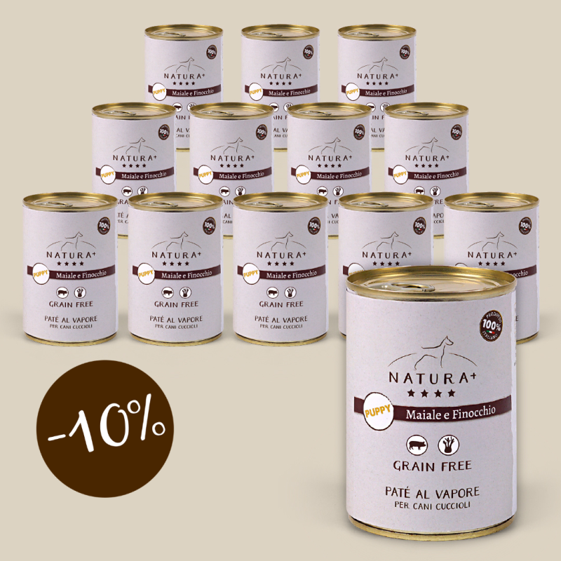 Paté per cani cuccioli con Maiale e Finocchio, 100% Grain Free e cotto delicatamente al vapore. Alimento ideale come pasto completo o sopra le crocchette. Lattina da 400gr.