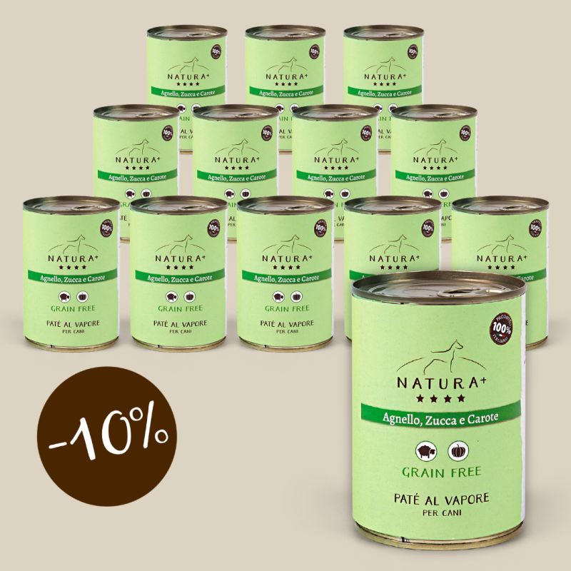 Paté con Agnello, Zucche e Carote, 100% Grain Free e cotto delicatamente al vapore. Alimento ideale come pasto completo o sopra le crocchette. Lattina da 400gr.