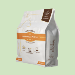 MINI. Ricetta Artigianale con gustosa carne di salmone e piselli. Le crocchette sono MINI, ideali per cani di piccola taglia o cani con problemi di masticazione. Alimento completo.