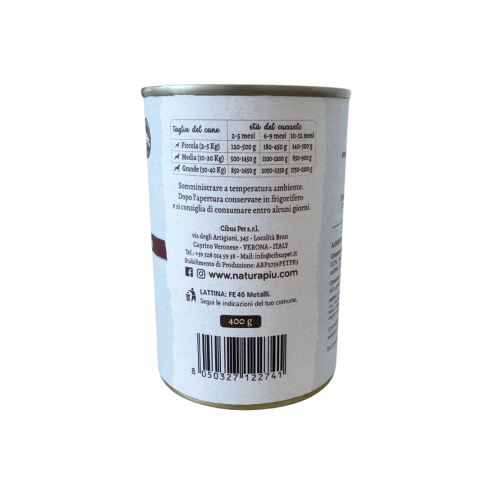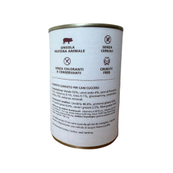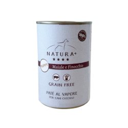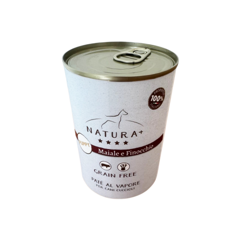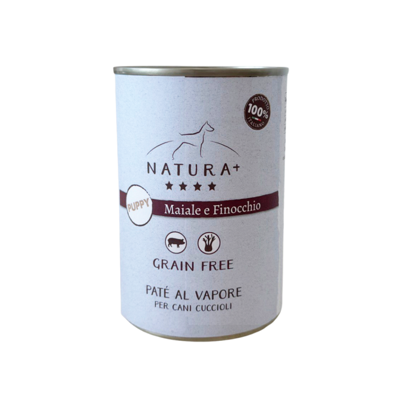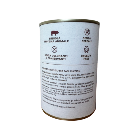 Paté per cani cuccioli con Maiale e Finocchio, 100% Grain Free e cotto delicatamente al vapore. Alimento ideale come pasto completo o sopra le crocchette. Lattina da 400gr.
