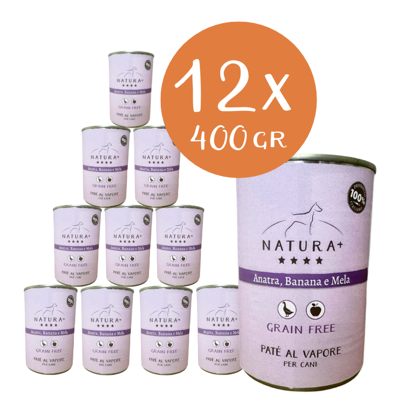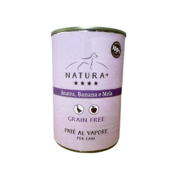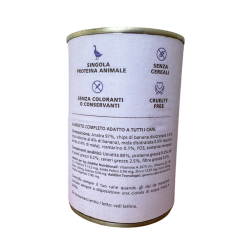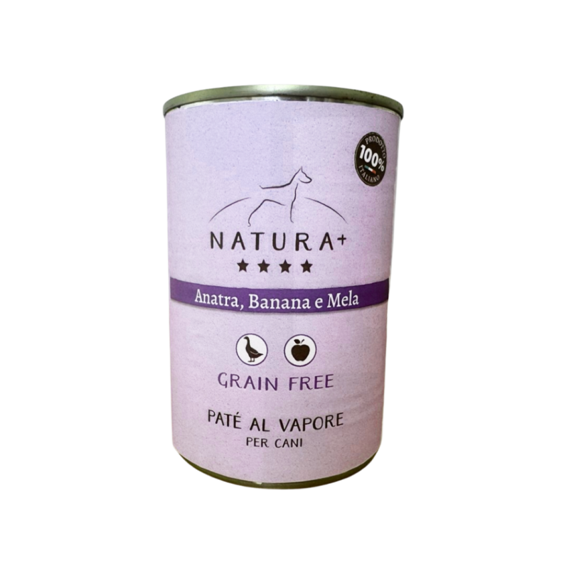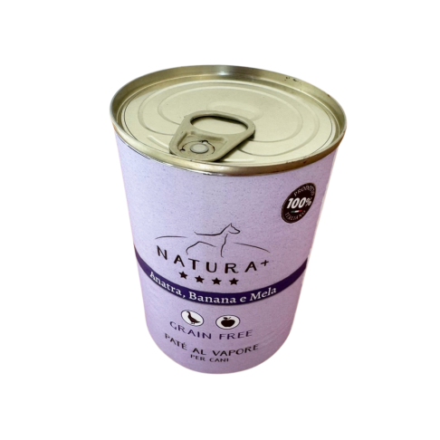 Paté con Anatra, Banana e Mela, 100% Grain Free e cotto delicatamente al vapore. Alimento ideale come pasto completo o sopra le crocchette. Lattina da 400gr.