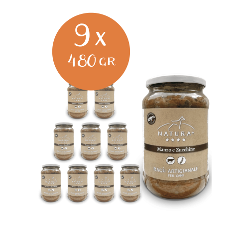 Ragù Artigianale grain free con manzo e zucchine. Ricetta in vasocottura, naturale, senza cereali, bilanciata. Barattolo in vetro da 480gr. Ideale come pasto completo o come aggiunta sopra le crocchette.
