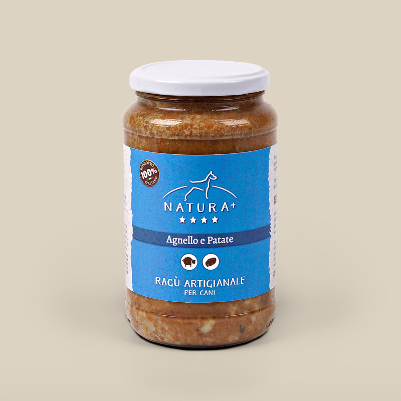Ragù Artigianale grain free con agnello e patate. Ricetta in vasocottura, naturale, senza cereali, bilanciata. Barattolo in vetro da 480gr. Ideale come pasto completo o come aggiunta sopra le crocchette.