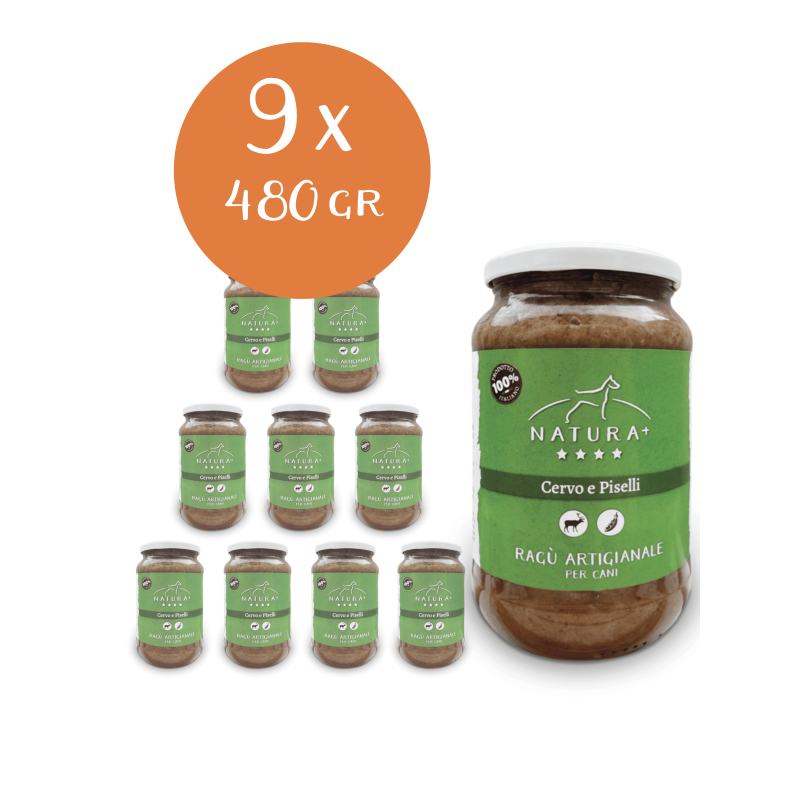 Ragù Artigianale grain free con cervo e piselli. Ricetta in vasocottura, naturale, senza cereali, bilanciata. Barattolo in vetro da 480gr. Ideale come pasto completo o come aggiunta sopra le crocchette.