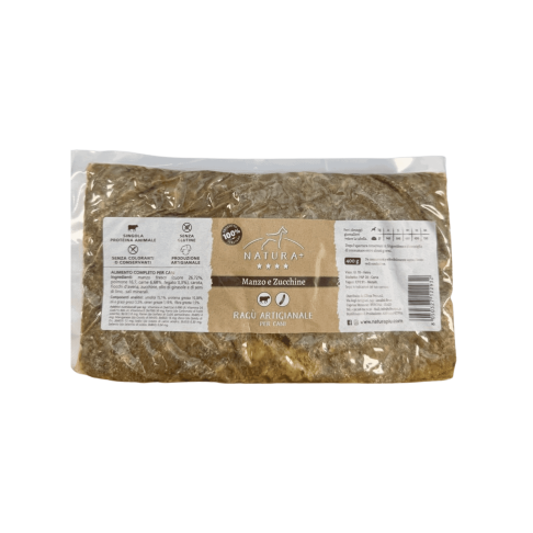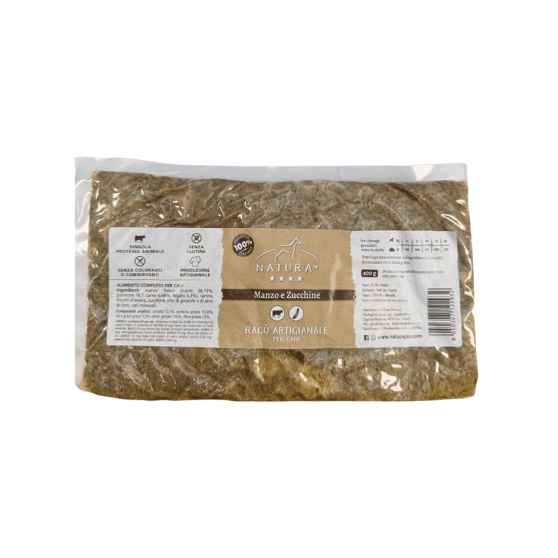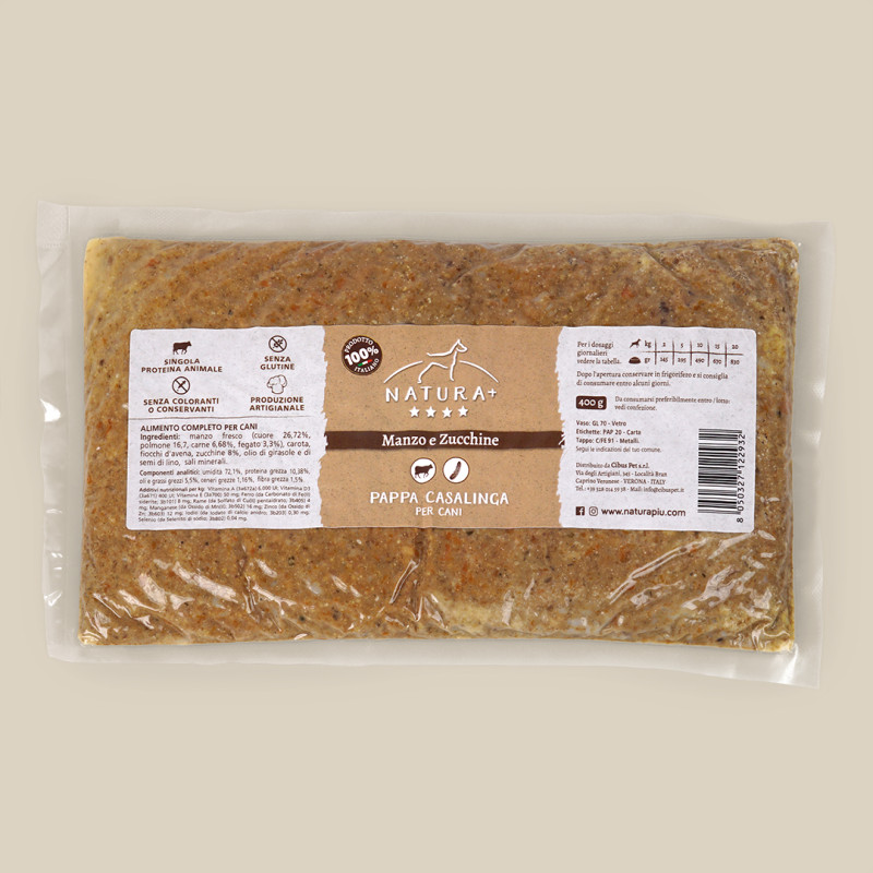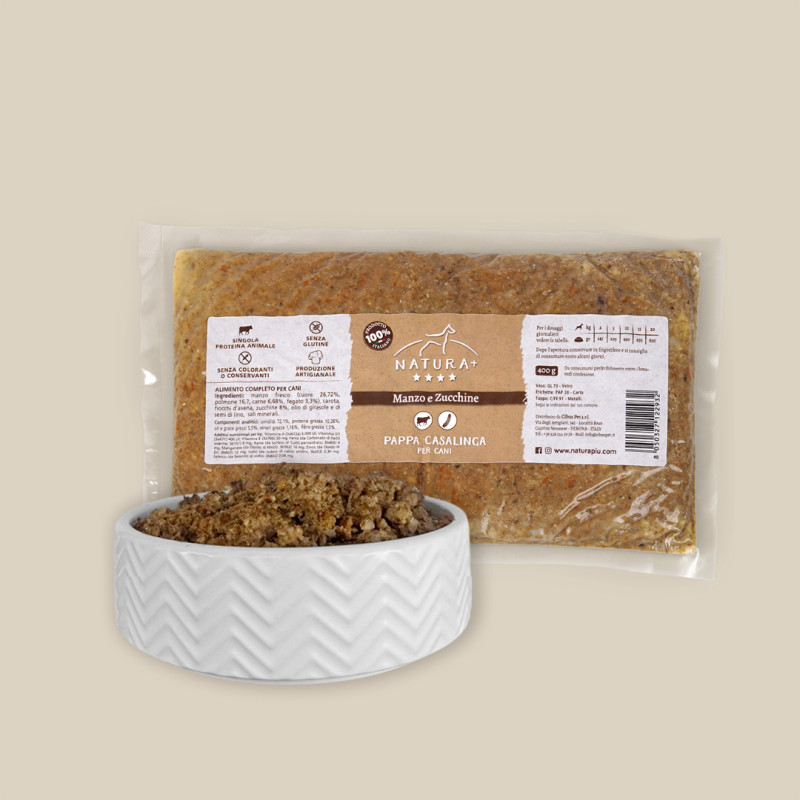 Pappa Casalinga e Artigianale con manzo e zucchine. Ricetta bilanciata e completa. Comode buste da 400g (n.10 pezzi) conservabili in dispensa. Ideale come pasto completo o come aggiunta sopra le crocchette.