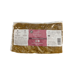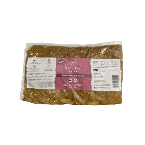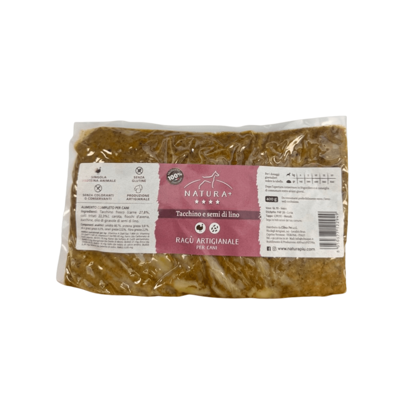 Pappa Casalinga e Artigianale con tacchino e semi di lino. Ricetta bilanciata e completa. Comode buste da 400g (n.10 pezzi) conservabili in dispensa. Ideale come pasto completo o come aggiunta sopra le crocchette.