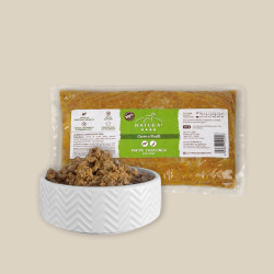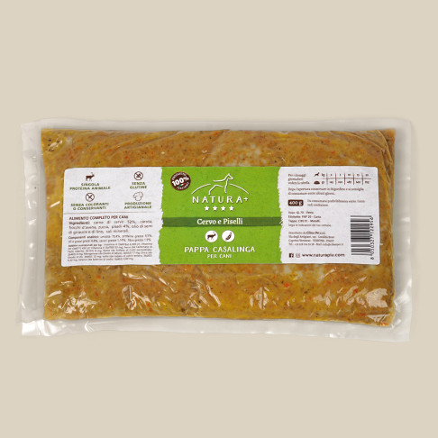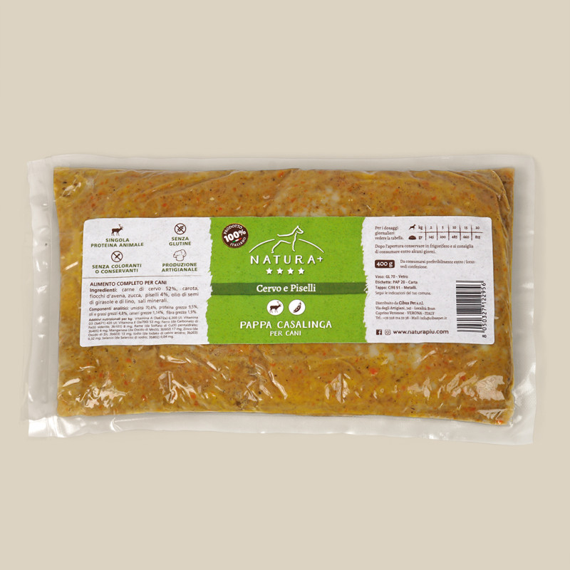 Pappa Casalinga e Artigianale con cervo e piselli. Ricetta bilanciata e completa. Comode buste da 400g (n.10 pezzi) conservabili in dispensa. Ideale come pasto completo o come aggiunta sopra le crocchette.