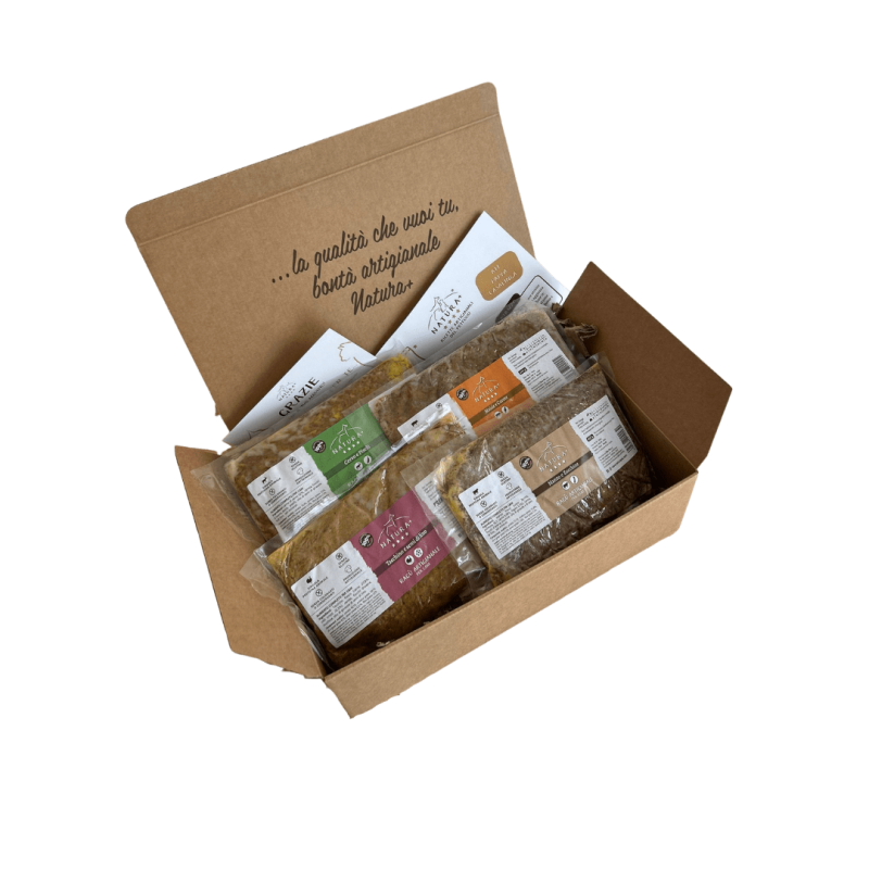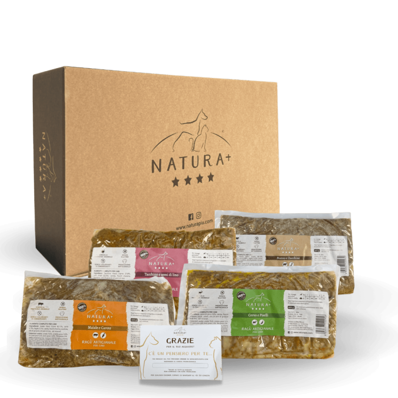 Il Kit perfetto per far provare al tuo cane le Ricette Artigianali Natura+. Un’accurata selezione di cibo umido, cucinato con ingredienti semplici e naturali. Ideale per chi cerca qualità e gusto in un pasto completo o come delizioso accompagnamento alle crocchette.