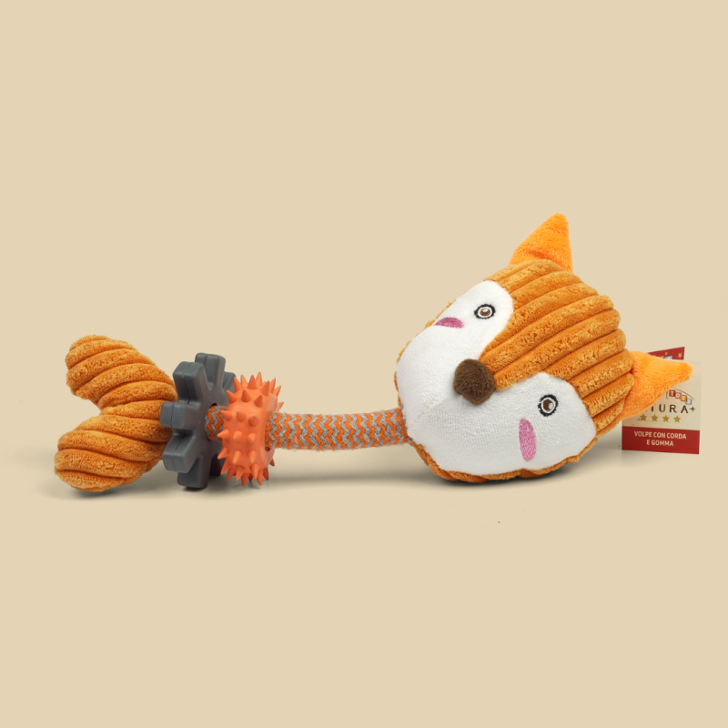 Design ibrido con gomma resistente e corda in canapa per un gioco completo: tirare, masticare, mordicchiare. Perfetto per sfogare energia e rafforzare denti e gengive.