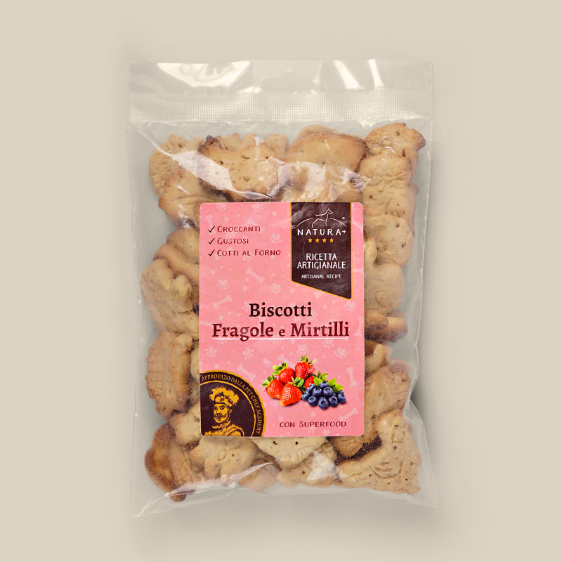 Biscotti fragola e mirtilli rossi, fonti di antiossidanti. Appetitosi premietti 100% naturali.