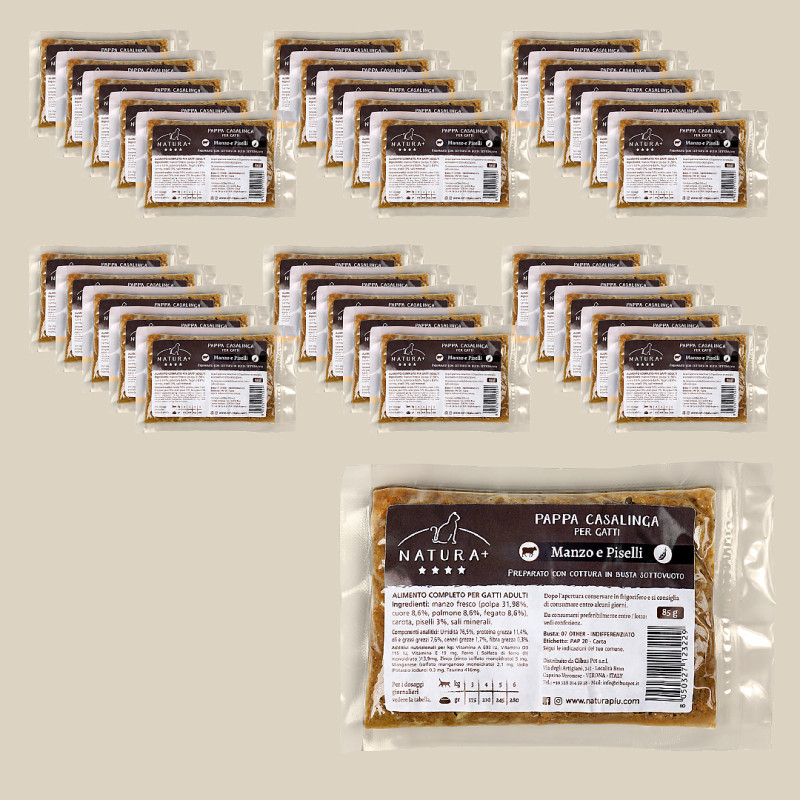 Pappa Casalinga e Artigianale con manzo e piselli. Comode buste da 85 g, senza cereali e bilanciate. Ideale come pasto completo o in aggiunta alle crocchette.